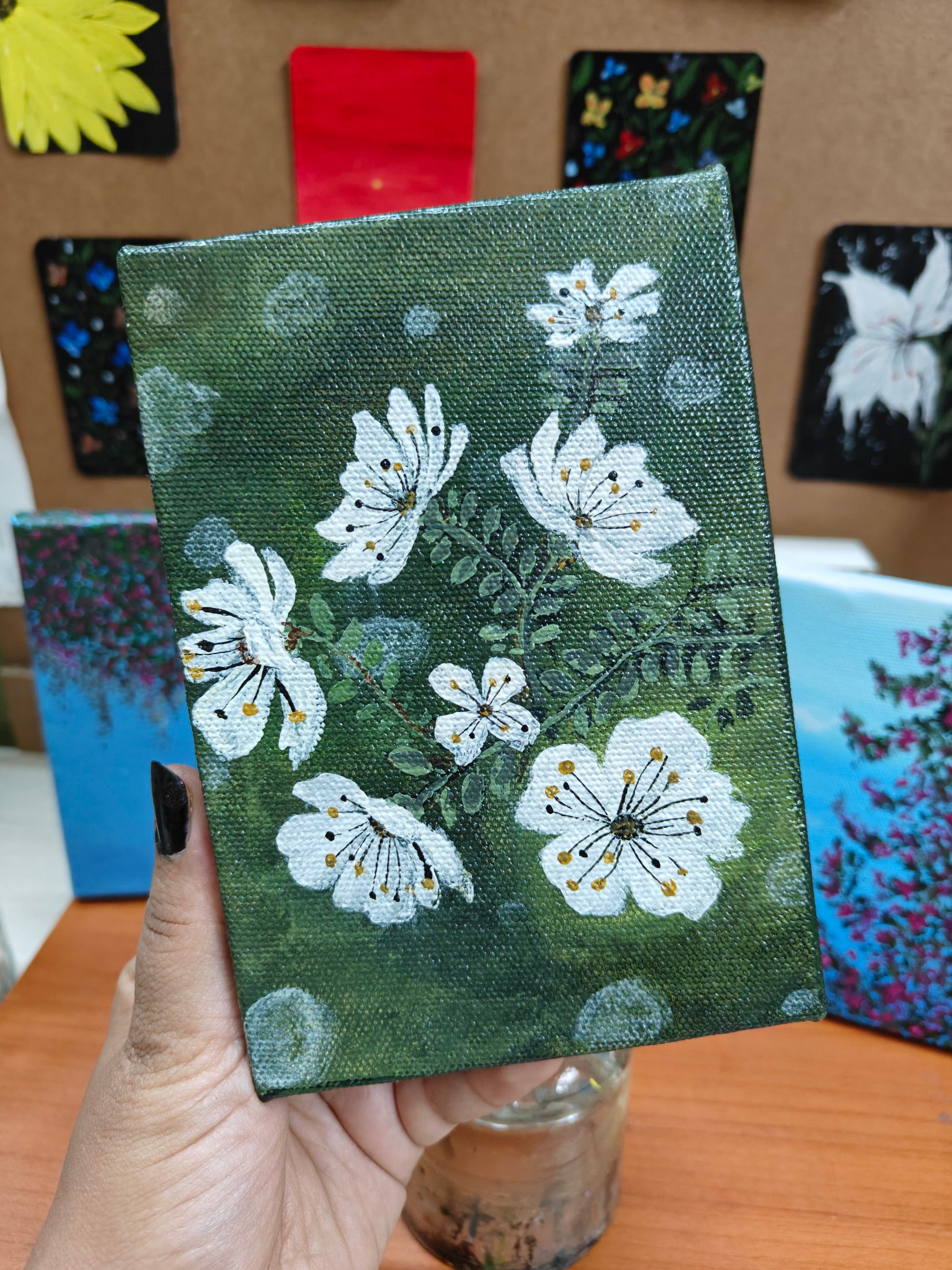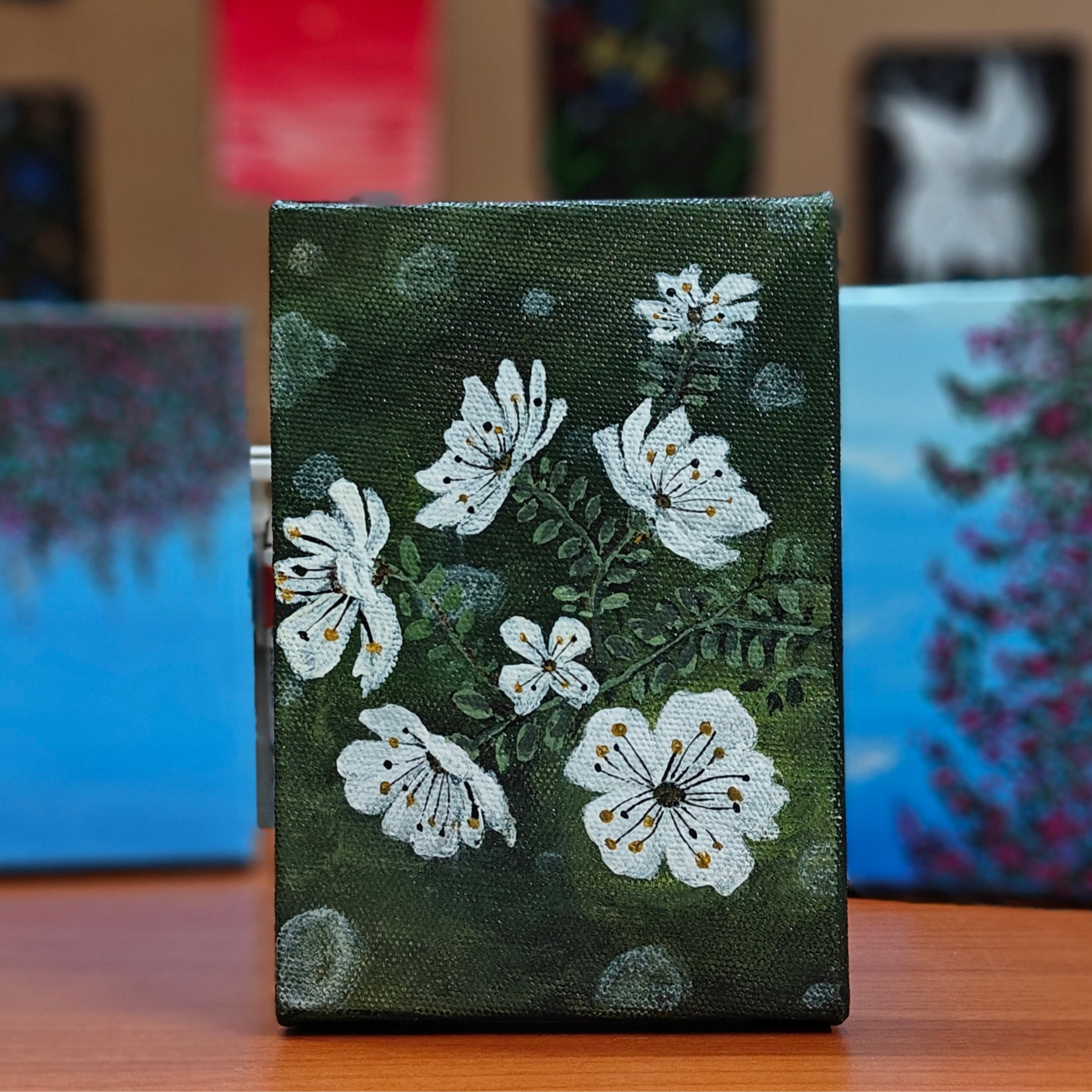 "Petals of Serenity" features delicate white flowers in full bloom, capturing nature's peaceful grace. Hand-painted on a stretched canvas, it brings a soft, tranquil vibe to any room.
