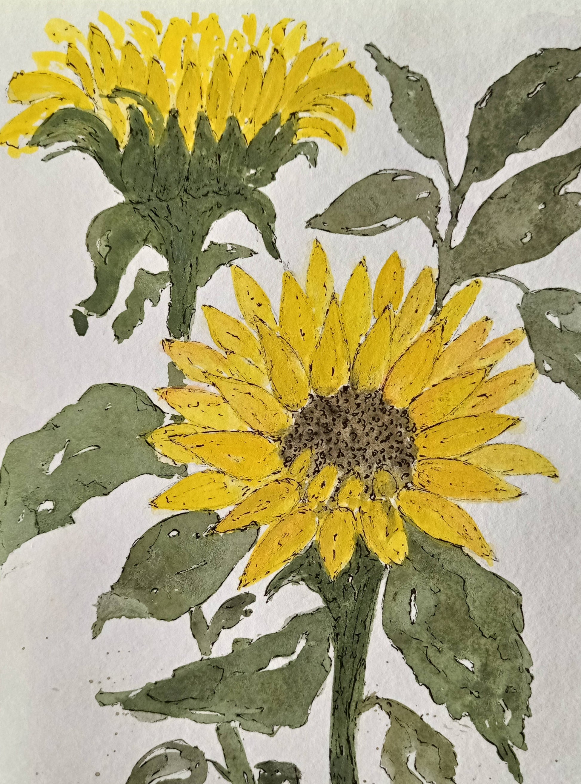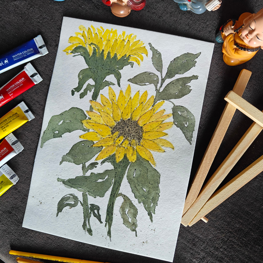 Golden Embrace this painting captures the radiant beauty of two sunflowers in full bloom. The vibrant yellows and warm tones evoke a sense of joy and the timeless charm of nature.