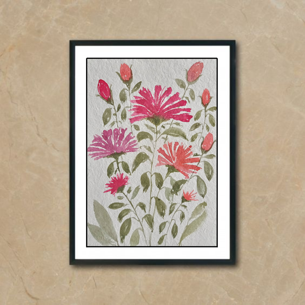 Whispers of Spring this painting captures the delicate beauty of nature with vibrant florals in full bloom & fresh buds, intertwined with soft, flowing leaves. The loose brushstrokes convey a sense of movement & life, evoking the peaceful renewal of spring.