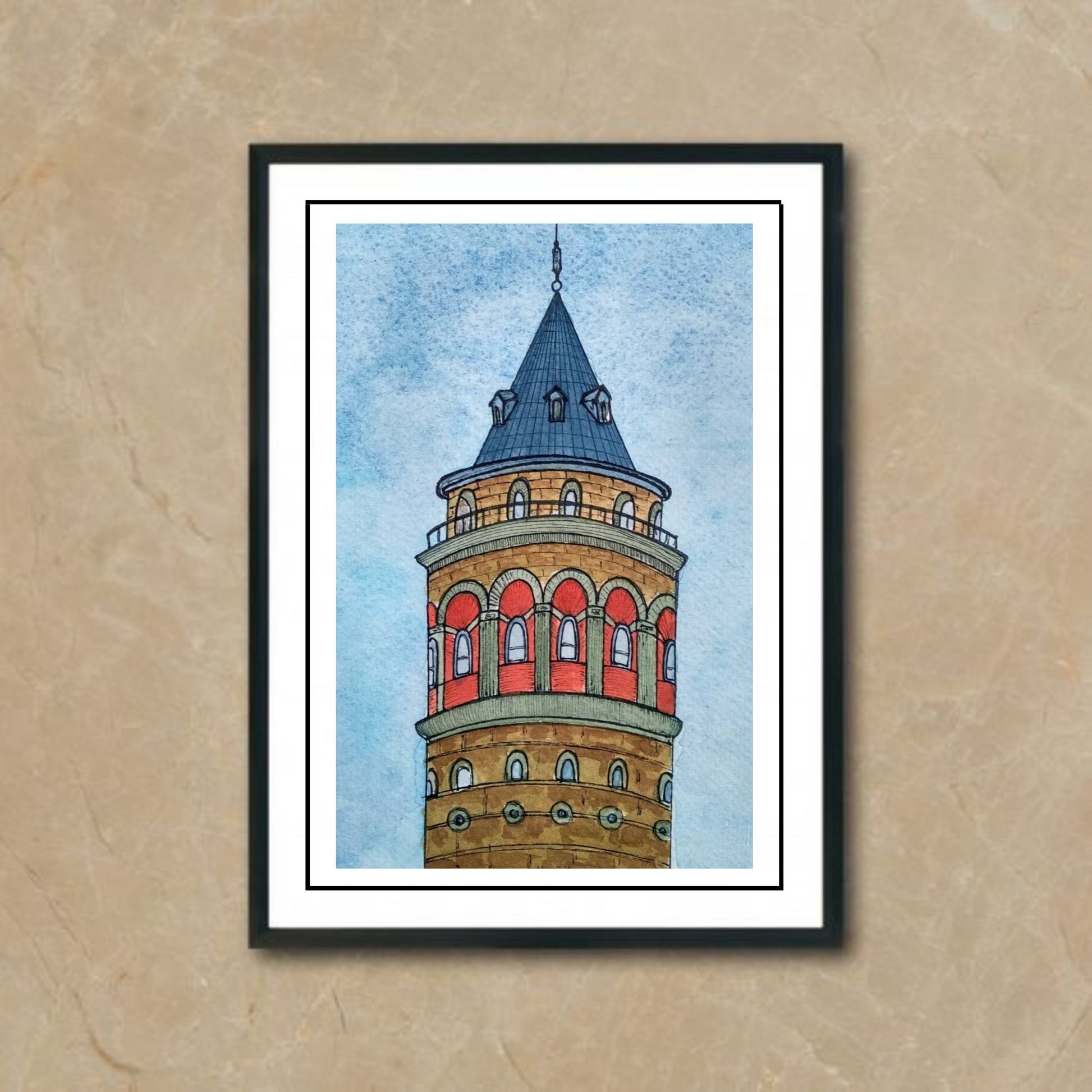 Whispers of Galata this painting captures the elegant charm and mystery of the iconic, Galata Tower seen from a unique perspective with only half of the structure visible. The soft, flowing watercolor strokes evoke a sense of quiet reverence, inviting the viewer to imagine the full grandeur of this architectural gem. The painting speaks to the hidden stories and history embedded within the tower’s ancient stones, making it a timeless tribute to Istanbul’s rich heritage.