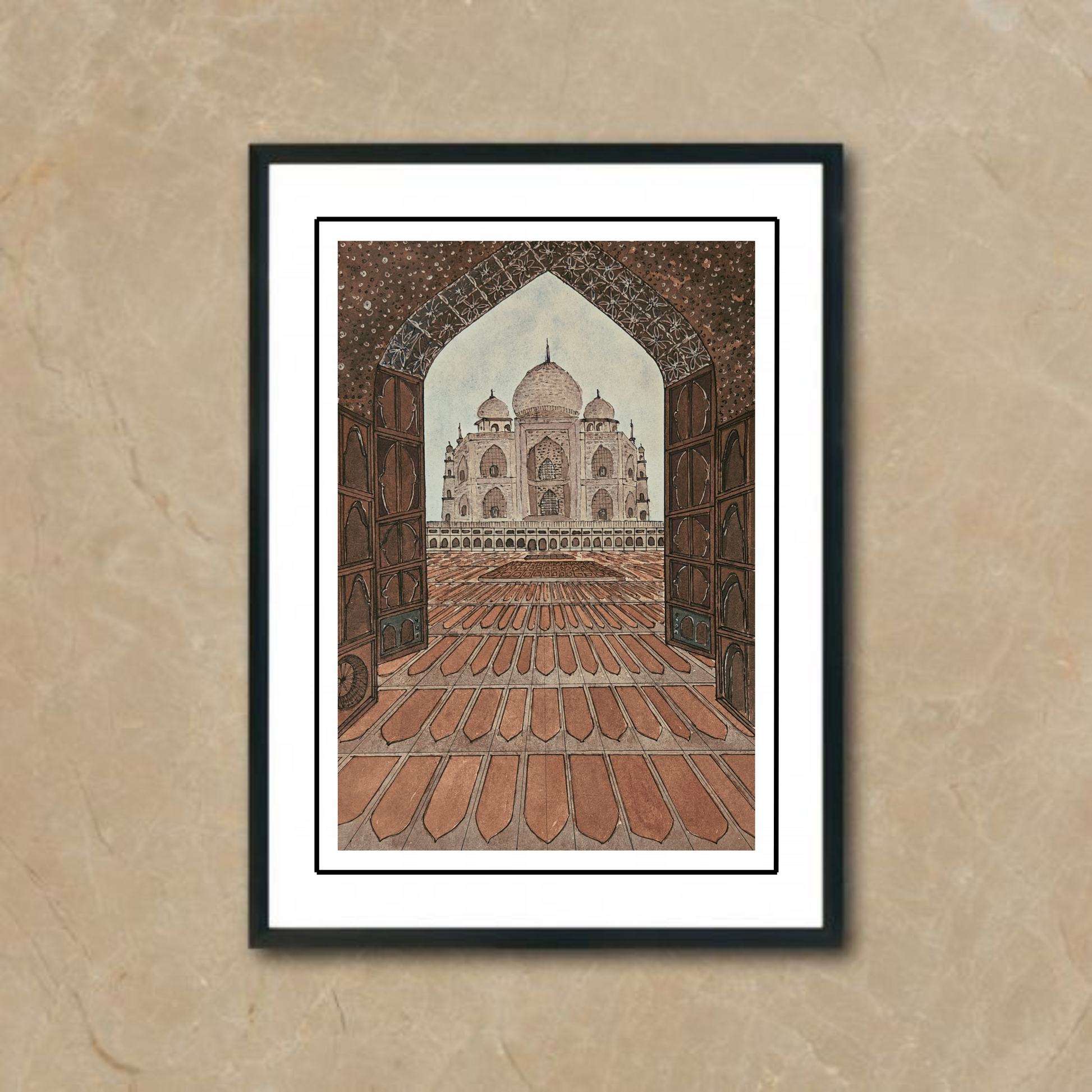This beautiful watercolor painting captures a breathtaking view of the Taj Mahal from a distant gateway, offering a unique perspective of this iconic monument. The soft, delicate strokes evoke the timeless beauty of this majestic structure, inviting you to experience its grandeur and elegance.